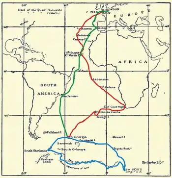 17 сентября 1921 года «Квест», стоящий в лондонском доке Сент-Кэтрин, посетил король Георг V[21], после чего судно пошло вниз по Темзе, собирая толпы провожающих на каждой набережной и мосту[16]. Шеклтон первоначально собирался идти в Кейптаун, посетив по пути важнейшие острова Южной Атлантики. Из Кейптауна «Квест» должен был двинуться к Земле Эндерби на побережье Антарктиды и исследовать побережье Земли Коутса в море Уэдделла. Выполнив программу, экспедиция должна была посетить Южную Георгию и вернуться в Кейптаун на зимовку для ремонта и доукомплектования на второй сезон работы[16]. Эти планы были нарушены уже в самом начале: серьёзные изъяны в конструкции двигателя заставили зайти на неделю в Лиссабон, а затем сделать остановки на Мадейре и Островах Зелёного мыса[22]. Шеклтон был вынужден отказаться от графика похода и повернул в Рио-де-Жанейро для капитального ремонта. В Рио «Квест» вошёл 22 ноября 1921 года[22]