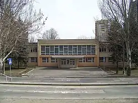 Интересную объемно-пространственную композицию всего комплекса красочно дополняет серия монументально-декоративных панно, расположенных на торцах классных блоков, а также на главном фасаде школы, обращённом к набережной реки Кальмиус: