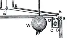 - Горизонтальное деревянное коромысло незначительной массы и длиной 183 см (6 футов) было подвешено на тонкой проволоке длинной 102 см (40 дюймов) прямо посередине. На каждом конце коромысла находилась небольшая свинцовая сфера диаметром 5,08 см (2 дюйма) с массой 0,73 кг (b на рисунках)[7]. Всё заключено в ящик из красного дерева, АААА, для предотвращения сквозняков и перепадов температуры, с небольшими отверстиями на торцах, закрытыми стеклом, что позволяло наблюдать за положением этих сфер. Небольшая сила позволяла этому горизонтальному коромыслу вращаться вокруг оси вращения, отмеченной проволокой, если та была достаточно тонкой[8][6].