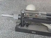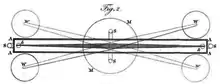 - Рядом с каждой из вышеупомянутых сфер b у Кавендиша была ещё одна неподвижная сфера, также сделанная из свинца, но гораздо более тяжёлая, 158 кг (20,3 см или 8 дюймов в диаметре). Они указаны на рисунках в двух разных позициях, WW и ww. Чтобы разместить их очень близко к маленьким сферам, Кавендиш разработал механизм, который активирует их перемещение на расстоянии, чтобы избежать помех — отмечено как ММ. Гравитационное действие этих сфер должно было притягивать маленькие сферы к шарам на коромысле, производя небольшое закручивание проволоки[6][14].