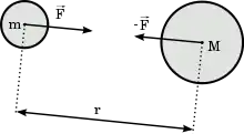 Сила гравитационного притяжения F между маленькой сферой массы m и большой сферой массы M, расстояние между центрами которых равно r, определяется выражением закона всемирного тяготения Исаака Ньютона: