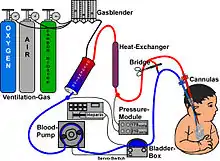 Для проведения ЭКМО к больному подсоединяют мембранный оксигенатор. Существует два способа подключения — вено-артериальная канюляция (ВАК) и вено-венозная канюляция (ВВК). При ВАК кровь забирается из венозного русла, очищается, насыщается кислородом и подаётся в артериальное русло. ВАК рекомендуется к применению у новорождённых, а также у взрослых с компенсированным инфарктом миокарда. При ВВК кровь забирается и возвращается в венозное русло. ВВК может применяться у взрослых с изолированным поражением лёгких. Для соблюдения физиологических механизмов забор и вливание крови осуществляется максимально близко к сердцу. ВАК предпочтительнее, так как при этом способе не происходит смешивание артериальной и венозной крови. ВВК требует вдвое большую поверхность мембран оксигенатора, поэтому на практике данный способ применяется реже.