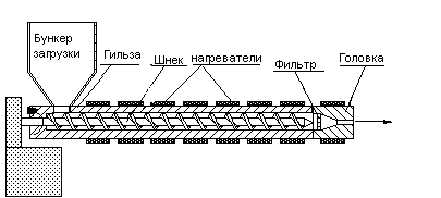 Экструдер состоит из: корпуса с нагревательными элементами; рабочего органа (шнека (винт Архимеда), диска, поршня), размещённого в корпусе; узла загрузки перерабатываемого материала; силового привода; системы задания и поддержания температурного режима, других контрольно-измерительных и регулирующих устройств. По типу основного рабочего органа (органов) экструдеры подразделяют на одно-, двух- или многошнековые (червячные), дисковые, поршневые (плунжерные) и др. Двухшнековые экструдеры в зависимости от конфигурации шнеков могут быть параллельными или коническими. В зависимости от направления вращения — с сонаправленным или противонаправленным вращением шнеков.