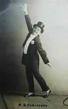 В первые десятилетия XX века значительным событием в искусстве эксцентрики становятся выступления русского автора-куплетиста, композитора, поэта, мима-эксцентрика и некоронованного «Короля Эксцентрики» — Михаила Николаевича Савоярова.[17] Именно он впервые в России вывел на эстраду авторский эксцентрический стиль исполнения, кардинально отличавшийся от циркового и театрального. Отличительной чертой артистического стиля Савоярова было неповторимое обаяние живого исполнения, пластичность, тонкая нюансировка, природная музыкальность и гибкость, способность к мгновенному перевоплощению, умение дополнять пение танцем и мимической репризой. Творчество Михаила Савоярова высоко ценил Александр Блок, состоявший с ним в приятельских отношениях и часто бывавший на его представлениях.[18] Из записных книжек Блока известно, что он специально водил свою жену Любовь Дмитриевну на выступления Савоярова для того чтобы она внимательно посмотрела и послушала, обратила внимание на то, каким образом и с какой интонацией следует читать поэму «Двенадцать». Блок ставил в пример выразительную, дерзкую, эксцентричную и, временами, эпатажную игру Савоярова и считал, что эту поэму нужно читать именно так, как это делал Савояров, «по-савояровски».[19]