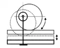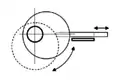 - Эксцентрик сам по себе выполнен как в предыдущем пункте, однако результирующее движение воспринимается в одной или в двух противоположных точках плоскостью (торцом) поступательного либо качающегося звена — толкателя. По своей сути это (простейший) вариант кулачкового механизма, создающий гармоничное движение, при котором перемещения толкателя пропорциональны косинусу (или синусу) угла поворота эксцентрика. Чаще всего применяется для привода поршней или мембран маломощных насосов (топливные насосы двигателей), а также для небольшого поступательного перемещения, например, преобразования вращательного движения ручки замка́ в возвратно-поступательное движение засова-защёлки.