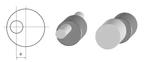 - Эксцентрик представляет собой два соединённых жёстко вала со смещёнными осями (либо вал с нецентральным отверстием). Один из валов (либо ось) вставляется в кольцо на опоре, на второй (рабочий) вал надевается кольцо, воспринимающее результирующее движение. По своей сути это кривошип очень маленького размера, и иногда эксцентрик используется именно в таком качестве, например, для создания вибраций. Однако чаще всего такая конструкция используется для регулировки: подвод опор колодок барабанных тормозов, регулировка натяжения приводных ремней на двигателях, согласование входов водопроводного смесителя и выходов на стене и т. п.