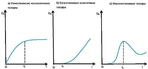 На рисунке а) «Эластичность спроса по доходу» спрос на неэластичные товары и услуги увеличиваются с ростом дохода потребителей до определённого уровня , когда спрос на эти товары и услуги начинают уменьшаться. На рисунке б) «Эластичность спроса по доходу» спрос на эластичные товары и услуги до некоторого уровня дохода отсутствует, а затем растет с ростом дохода потребителя. На рисунке в) «Эластичность спроса по доходу» спрос на некачественные товары и услуги вначале растёт, но с уровня дохода начинает сокращаться[2].