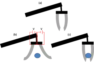 Принцип работы ЭАП схвата. (b) При приложении напряжения ЭАП пластины расходятся и схват можно подвести к объекту. (c) При снятии напряжения ЭАП пластины принимают первоначальную форму и удерживают объект