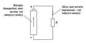 Как показано на рисунке, электрический ток, нормальное направление которого — от «плюса» к «минусу» то есть от положительного полюса источника тока к отрицательному полюсу, внутри источника ЭДС (например, внутри гальванического элемента) течёт в противоположном направлении. Направление от «плюса» к «минусу» совпадает с направлением электростатической силы, действующей на положительные заряды. Поэтому для того, чтобы заставить ток течь в противоположном направлении, необходима дополнительная сила неэлектростатической природы (центробежная сила, сила Лоренца, силы химической природы, сила со стороны вихревого электрического поля) которая бы преодолевала силу со стороны электростатического поля. Диссипативные силы, хотя и противодействуют электростатическому полю, не могут заставить ток течь в противоположном направлении, поэтому они не входят в состав сторонних сил, работа которых используется в определении ЭДС.