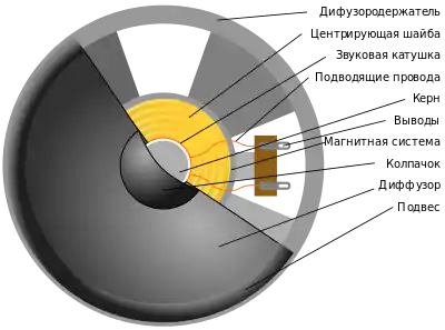 Неподвижная часть электродинамического громкоговорителя включает диффузородержатель и магнитную систему. Диффузор упруго соединяется с диффузородержателем снаружи при помощи подвеса, а изнутри — с помощью центрирующей шайбы. К диффузору жёстко прикреплена звуковая катушка, которая может свободно перемещаться в магнитном зазоре, не касаясь стенок. Отверстие в центральной части диффузора накрывается защитным колпачком.