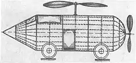 Конструкция электролёта представляла собой горизонтально расположенный продолговатый цилиндр с конусом спереди и полусферой сзади. Несущий винт располагался на боковой поверхности цилиндра. Он имел две лопасти размером 10 на 1,2 м каждая. Для изменения высоты полёта имелся особый механизм, который менял угол установки лопастей. Второй винт для управления аппаратом тоже имел две лопасти и крепился к полусфере[2]. По другой версии электролёт представлял собой вертикальный цилиндр, и основной винт крепился над конусом[3][1].
