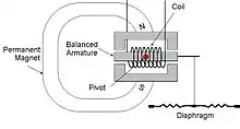 Простейший электродинамический преобразователь состоит из постоянного магнита, насаженных на полюсные наконечники обмоток электромагнита и мембраны из магнитомягкого материала, заключённых в корпус из немагнитного материала. В исходном состоянии мембрана притягивается к полюсным наконечникам за счёт постоянного магнита, из-за чего прогибается в их сторону. При пропускании тока через электромагнит, в зависимости от направления тока, магнитные поля постоянного магнита и электромагнита складываются либо вычитаются. Если их векторы магнитной индукции направлены в одну сторону, они складываются и мембрана сильнее притягивается к полюсным наконечникам. Если в разные — магнитный поток уменьшается, мембрана распрямляется под действием силы упругости.