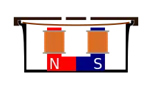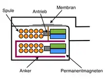 Один из вариантов такого механизма изображён на рисунке. Здесь обмотка электромагнита расположена вокруг якоря, а сам якорь насажен на ось. В зависимости от направления тока через электромагнит, якорь будет притягиваться к правому верхнему и левому нижнему полюсу или правому нижнему и левому верхнему. Через тягу якорь соединён с диффузором.