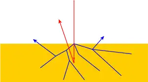 Конечное разрешение электронной литографии определяется не только диаметром сфокусированного пучка, а ещё характером его взаимодействия со слоем резиста. Соударение электронов первичного, высокоэнергетического пучка электронов (красная линия) с атомами материала резиста порождает в нём затухающую лавину вторичных выбитых электронов (синии линии), вторичные электроны паразитно «засвечивают» резист. В результате экспонированное пятно в плёнке резиста оказывается в несколько раз больше по размеру относительно диаметра электронного пучка.