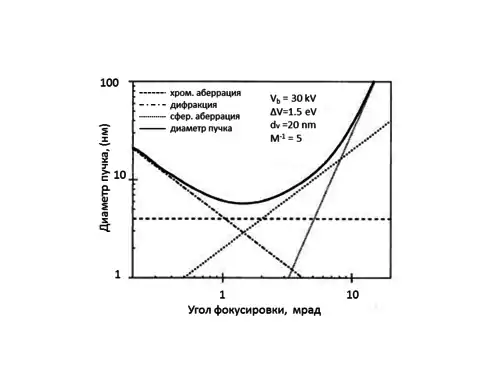 На диаметр электронного пучка влияют несколько факторов: размер источника электронов и коэффициент маcштабирования электронной фокусирующей системы . Эти параметры связаны между собой формулой: