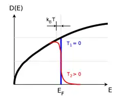 Распределение электронов в газе по энергии (эВ-1см-3) описывается произведением плотности состояний (в трёхмерном случае пропорциональной корню из энергии электрона ) и функции Ферми—Дирака для числа заполнения состояний (см. рис.). Проинтегировав по энергии, можно получить концентрацию электронов (см-3) в данной точке. Функция (эВ-1), нормирована на единицу () и задаёт плотность статистического распределения электронов по энергии.