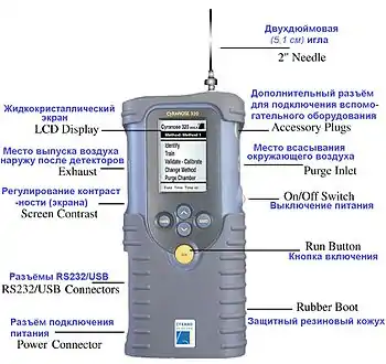 Основными частями устройства является пробоотборная система, блок детекторов и блок обработки сигналов.
