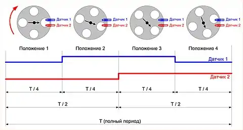 Реверсивные счётчики импульсов чаще всего используются при работе с 2-х канальными энкодерами или с двумя индуктивными датчиками, при этом: