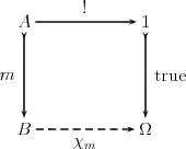 Элементарный топос — это декартово замкнутая конечно полная категория, в которой существует выделенный объект , называемый классификатором подобъектов, и мономорфизм в него из терминального объекта , называемый истиной (также обозначается ), такой что для любого мономорфизма существует единственный морфизм , для которого диаграмма