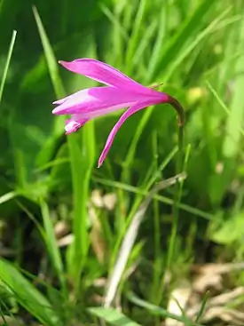 Клубневой геофит[9]. Травянистое многолетнее[3] растение высотой до 30 см. Корень клубневидный, толщиной до 6 мм. Лист до 15 см в длину и 8 мм в ширину, единичный, прикорневой, узкий, ланцетовидный. Цветок розово-пурпурного цвета, по одному (реже двум) на каждом растении. Плод — коробочка. Цветёт в июле, плодоносит в сентябре—ноябре. Размножается с помощью семян[2].