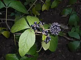 Плоды почти шаровидные, 7—10 мм длины, чёрные, с резким специфическим запахом, несъедобные, с пятью сплюснутыми семенами. Цвётет в июле, плоды созревают в сентябре и подолгу висят[7][8].