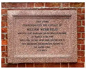 Эта доска напоминает о славном деянии Уильяма Уэбба Эллиса, первого, кто осмелился нарушить правила футбола, схватив мяч руками и побежав с ним. Так возникла игра регби в 1823 году.