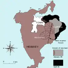 Лавовые потоки также стекали в море к востоку от острова, создавая новые участки суши и добавив более 2 км² к острову, но при этом оказались разрушены несколько сотен домов в восточной части города. Потоки лавы были многометровой толщины и вязкими по составу, так называемая аа-лава, с грубой, покрытой обломками застывшего базальта поверхностью (исландский: apalhraun). Позже в течение извержения лава уничтожила один рыбоперерабатывающий завод и повредила два других[2].