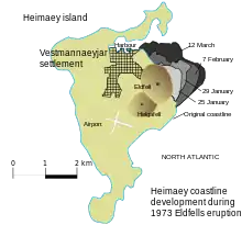 Во время извержения 23 января 1973 года лежащий по соседству город Хеймаэй был практически засыпан чёрным вулканическим пеплом, многие дома разрушены. Стекавшая в море раскалённая лава угрожала существованию рыболовного и транспортного порта Хеймаэй. Всё население острова (4.227 человек) было срочно эвакуировано судами рыболовного флота острова. После окончания активной фазы извержения и восстановления строений подавляющая часть местных жителей вернулась на остров. Охлаждённая с помощью морской воды, стекавшая в океан и постепенно застывавшая лава увеличила площадь острова. На этой новой территории были построены 200 новых зданий.