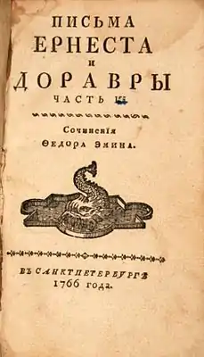 ![]() Титульный лист «Писем Эрнеста и Доравры», в 4-х частях, изд. в 1766 и 1792 гг., подражание «Новой Элоизы» Руссо | |