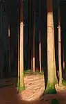 В последние годы своей жизни художник нередко изображал тенистые уголки леса с отдельными ярко освещёнными стволами. Солнечный свет, падающий на кору, создаёт сильнейший контраст между тёмным фоном и причудливыми световыми пятнами[6].