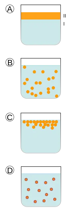- Лиофобные эмульсии возникают при механическом, акустическом или электрическом эмульгировании (диспергировании), а также вследствие конденсационного образования капель дисперсной фазы в перенасыщенных растворах или расплавах. Они термодинамически неустойчивы и длительно существуют лишь в присутствии эмульгаторов — веществ, облегчающих диспергирование и препятствующих коалесценции (слиянию). Эффективные эмульгаторы — мицеллообразующие ПАВ, растворимые высокомолекулярные вещества, некоторые высокодисперсные твёрдые тела.
