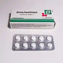 Эналапри́л (систематическое наименование: (S)-1-[N-[1-(этоксикарбонил)-3-фенилпропил]-L-аланил]-L-пролин) — лекарственное средство, один из препаратов группы ингибиторов ангиотензинпревращающего фермента. В основном применяют для лечения высокого артериального давления (артериальной гипертензии), хронической сердечной недостаточности, для снижения смертности после сердечных приступов, а также при некоторых проблемах с почками, вызванных сахарным диабетом. Активный метаболит — эналаприлат — базовый препарат для лечения осложнённых гипертонических кризов при отсутствии противопоказаний.