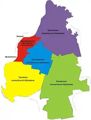 В Энгельсский муниципальный район входят 5 муниципальных образований, в том числе 1 городское поселение и 4 сельских поселения[17][18]: