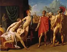 C 1800 года Энгр участвовал в конкурсе на соискание Римской премии, представив полотно «Сципион с сыном и послами Антиоха» (не сохранилось), но оно заняло только второе место[8]. Художник продолжал напряжённо работать, в январе 1801 года он был удостоен премии за натурное поясное изображение «Мужской торс». Это полотно показывает, что 21-летний Энгр уже сложился как художник-академист, способный одинаково легко работать с силуэтом, эффектами освещения и формами[16]. В том же 1801 году картина «Послы Агамемнона у Ахилла» была удостоена Римской премии, что позволяло Энгру на четыре года отправиться во Французскую Академию в Риме. Сюжет полотна взят из Троянского цикла: изображены Одиссей (в красном одеянии), Аякс и старец Феникс, направленные Агамемноном примириться с великим героем. Ахилл изображён играющим на лире в компании Патрокла. Критики отмечали, что из-за стремления Энгра показать историю во всех деталях, левая часть работы выглядит несколько перегруженной[7]. В. И. Раздольская писала, что Энгр следовал в «Послах» классицистским принципам — композиция построена как барельеф, персонажи также решены статуарно, причём художник достаточно свободно интерпретировал античные прототипы[17]. Ф. Конисби отмечал, что «Торс» и «Послы…» обозначают окончательный разрыв Энгра и Давида: эти картины отмечены сильным влиянием стиля Джона Флаксмана, причём Энгр весьма последовательно воплощал флаксмановскую графичность средствами живописи маслом[16]. В 1801 году картина стала дебютом Энгра на парижском Салоне и вызвала одобрительные отзывы. В 1802 году картину осмотрел и Флаксман, который нашёл её «лучшим из всего, что было создано современной французской школой»[16]. Этот отзыв стал известен Давиду и глубоко его уязвил, вскоре последовал полный разрыв в отношениях учителя и ученика. Из-за противодействия Давида Энгр смог вновь выставить свои произведения только на Салоне 1806 года. Кроме того, из-за тяжёлого экономического положения государства Энгру пришлось пять лет ожидать ассигнований на поездку в Рим[17].