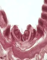 Эндостиль представляет углубление, более глубокое у оболочников и выстланное частью мерцательными, частью железистыми клетками. Клетки, лежащие на самом дне углубления, то есть на срединной линии, несут более длинные волоски. У оболочников боковые поверхности желобка несут с каждой стороны несколько продольных полос железистых клеток. Точно также у бесчерепных наблюдаются 4 полосы таких клеток. У кишечножаберных эндостиль представлен всем нижним отделом передней части кишечника, служащим для проведения пищи, тогда как вода идет к жабрам по верхнему отделу. У позвоночных эндостиль преобразован в щитовидную железу[1] (у миног это превращение наблюдается в онтогенезе)[2].