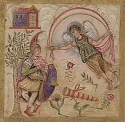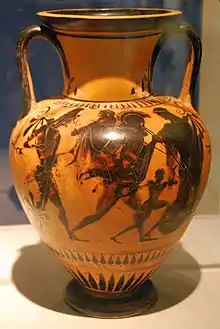 ![]() Япиг вынимает наконечник стрелы из ноги Энея, пока его сын, Асканий, плачет рядом с ним. Античная фреска из Помпей | |