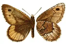 Длина переднего крыла 21 мм. Основной фон верхней стороны крыльев — коричневый. На внешнем поле сверху на обоих крыльях проходит широкая бледно-желтоватая перевязь. На этой перевязи на переднем крыле располагается три чёрных пятна, а на заднем — одно, расположенное ближе к заднему краю крыла. Рисунок нижней стороны заднего крыла мраморовидный, образованный мелкими волнистыми полосами серо-коричневого цвета[1].
