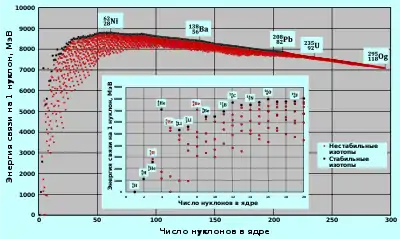 Энергия связи адронов атомного ядра определяется в основном сильным взаимодействием. Для большинства ядер она составляет ~8 МэВ на нуклон.