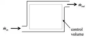 В англоязычной литературе, особенно технической, понятие открытой системы обычно отождествляют с понятием «контрольного объёма» (англ. control volume)[39], который ограничен воображаемой неподвижной контрольной[40] поверхностью, проницаемой для вещества, но оставляющей неизменной заключённый в ней объём. В то же время закрытую систему называют «контрольной массой» (англ. control mass). Последнее название подчеркивает постоянство массы (), вследствие которого справедливо приведённое выше соотношение для дифференциала внутренней энергии и термодинамическое состояние системы характеризуется только двумя параметрами, например, и . С другой стороны, при постоянстве контрольного объёма () заключённая в нём внутренняя энергия тоже характеризуется только двумя параметрами, например, энтропией и переменной массой , причём в практически важное выражение для дифференциала внутренней энергии контрольного объёма входит (удельная) энтальпия[41]: