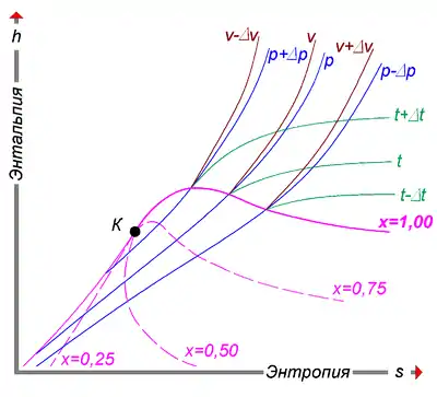 Удельную энтальпию можно представлять графически в виде -диаграммы Молье. На диаграмме кривые (изобары) для различных значений давления задают функцию [44]. Большой практический интерес представляет диаграмма Молье для воды/водяного пара[45], схематически изображённая на рисунке: синие линии — изобары, зелёные — изотермы. Область ниже красной кривой соответствует двухфазной среде пара и воды. В этой области красные линии соответствуют различным значениям величины — массовой доли водяного пара — и пересекаются в критической точке K, а изобары совпадают с изотермами и являются прямыми линиями.