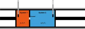 Сохранение энтальпии в процессе Джоуля — Томсона привлекается для количественного описания эффекта. Схема процесса представлена на рисунке 2. Левый поршень, вытесняя газ под давлением из объёма , совершает над ним работу . Пройдя через дроссель и расширяясь в объём , газ совершает работу над правым поршнем. Суммарная работа , совершенная над газом, равна изменению его внутренней энергии , так что энтальпия сохраняется: [63][64]