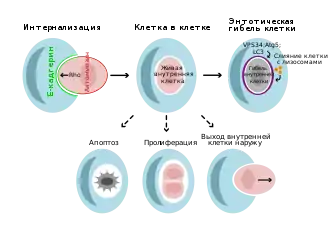 - Kroemer G., Perfettini J. L. Entosis, a key player in cancer cell competition. (англ.) // Cell research. — 2014. — Vol. 24, no. 11. — P. 1280—1281. — doi:10.1038/cr.2014.133. — PMID 25342563.