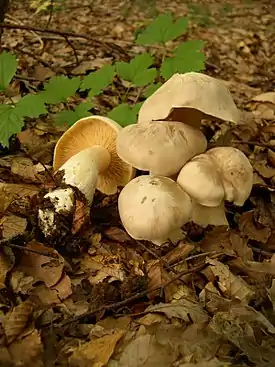 - Подрод Pouzarella включает миценоидные или иноцибоидные грибы с бурыми пластинками, опушёнными шляпкой и ножкой и гифами без пряжек[27].