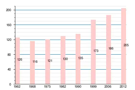 | 1962 | 1968 | 1975 | 1982 | 1990 | 1999 | 2005 | 2006 | 2010 | 2011 | 2012 |