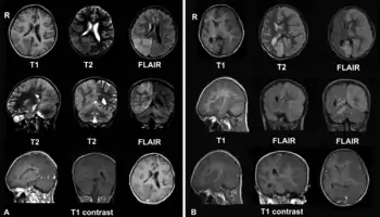 ![]() КТ головного мозга 8-летней девочки с энцефалитом Расмуссена в острой стадии. | |