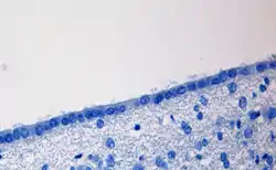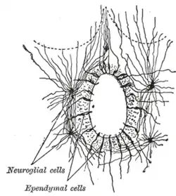 Эпендимоциты — эпителиоподобные клетки нейроглии, выстилающие все желудочки мозга и центральный канал спинного мозга[3]. Эпендимоциты выполняют в центральной нервной системе опорную, разграничительную и секреторную функции. Тела эпендимоцитов вытянуты, на свободном конце — реснички (теряемые во многих отделах мозга после рождения особи). Биение ресничек способствует циркуляции спинномозговой жидкости. Между соседними клетками имеются щелевидные соединения и пояски сплетения, но плотные соединения отсутствуют, так что цереброспинальная жидкость может проникать между ними в нервную ткань.[5]