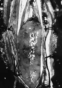 В редких случаях эпендимомы вырастают до гигантских размеров с выраженным экстрамедуллярным компонентом[27]. Также возможно метастазирование опухолевых клеток эпендимомы по субарахноидальному пространству спинного мозга в виде множественных экстрамедуллярных узлов различного размера, что является характерным для анапластической формы новообразования[34].