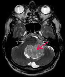 ![]() МРТ больного с эпендимомой IV желудочка в Т1-взвешенном режиме. Опухоль отмечена стрелкой | |