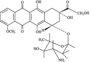 (8S-цис)-10-(3-амино-2,3,6-тридезокси-альфа-L-арабиногексо-пиранозил)окси-7,8,9,10-тетра-гидро-6,8,11-тригидрокси-8-(гидроксилацетил)-1-метокси-5,12-нафтацендион (также в виде гидрохлорида)[1] |