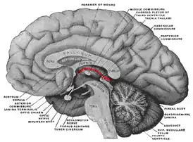 ![]() Мезиальный вид головного мозга человека. Разрез по средней сагиттальной плоскости. Эпиталамус отмечен красным. Его компоненты, показанные здесь - спайка поводков, шишковидная железа, задняя комиссура, передняя проекция которой плавно переходит в мозговую полоску таламуса. | |
